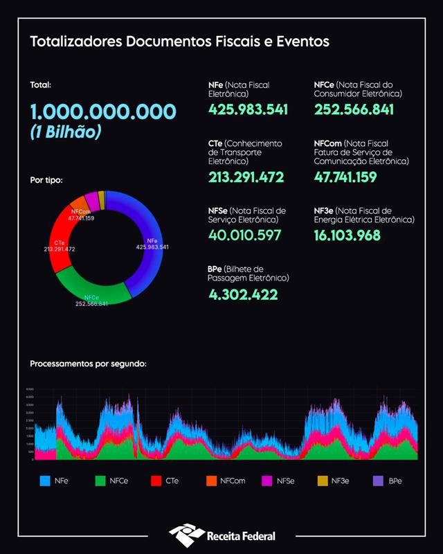 - NF-e (Nota Fiscal Eletrônica): 425.983.541 emissões;